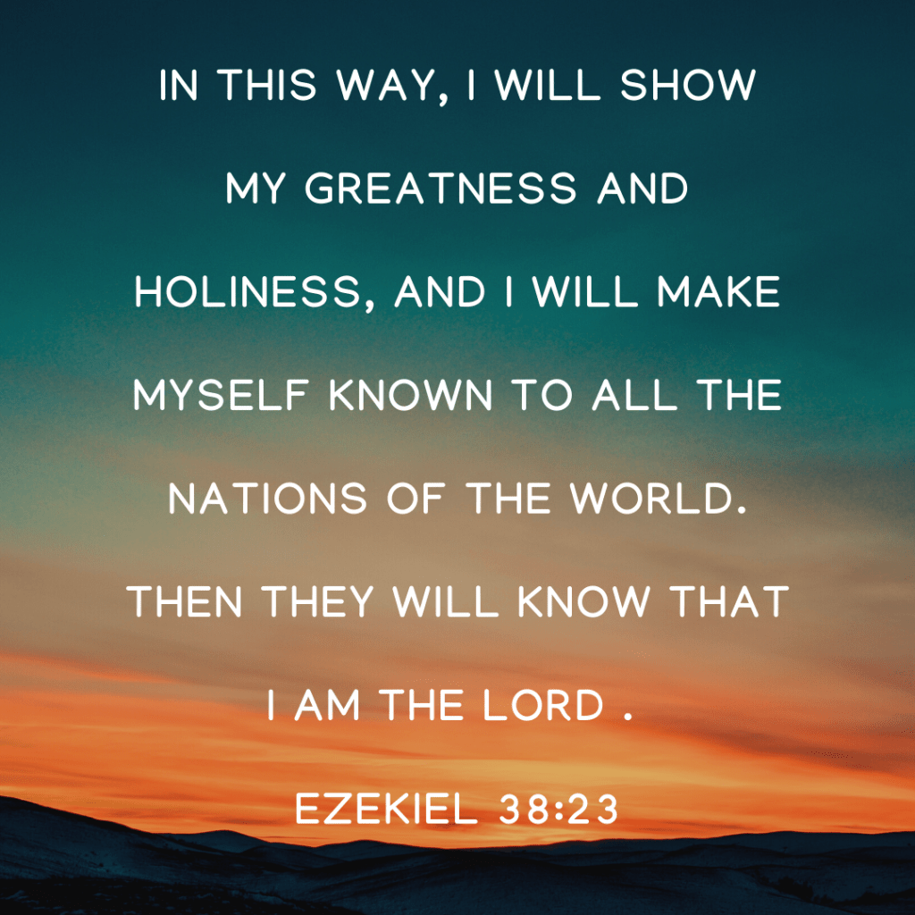 In this way, I will show my greatness and holiness, and I will make myself known to all the nations of the world. Then they will know that I am the Lord. Ezekiel 38:23