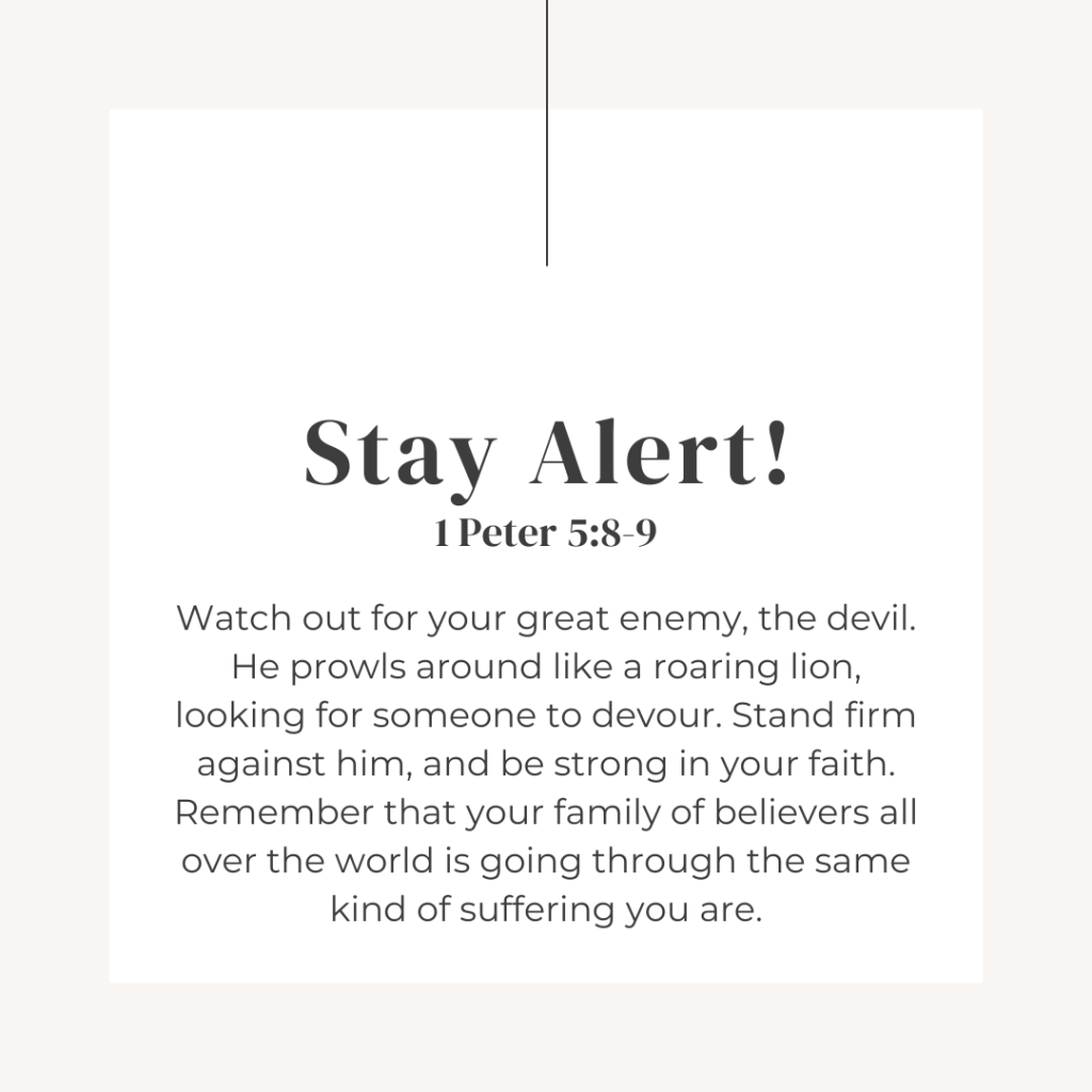 Stay alert! Watch out for your great enemy, the devil. He prowls around like a roaring lion, looking for someone to devour. Stand firm against him, and be strong in your faith. Remember that your family of believers all over the world is going through the same kind of suffering you are. 1 Peter 5:8‭-‬9