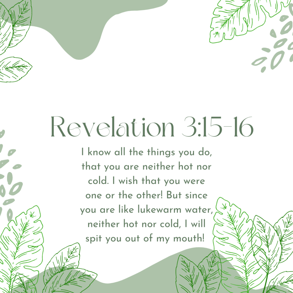I know all the things you do, that you are neither hot nor cold. I wish that you were one or the other! But since you are like lukewarm water, neither hot nor cold, I will spit you out of my mouth! Revelation 3:15-16