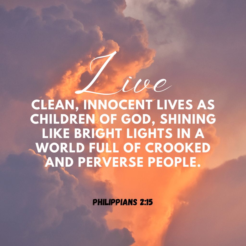 Live clean, innocent lives as children of God, shining like bright lights in a world full of crooked and perverse people. Philippians 2:15