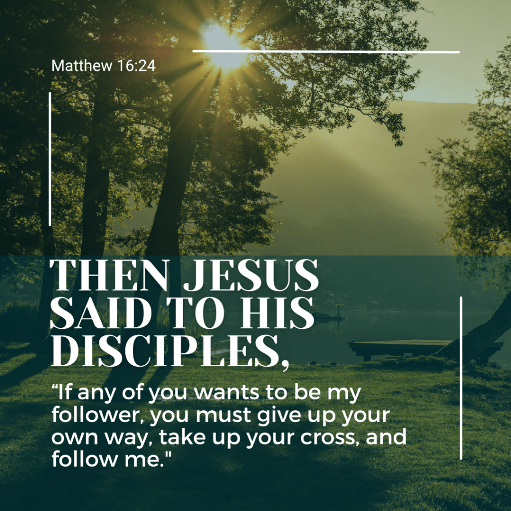 Then Jesus said to his disciples, “If any of you wants to be my follower, you must give up your own way, take up your cross, and follow me.” Matthew 16:24