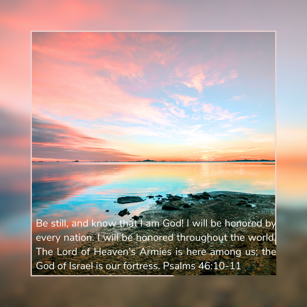Be still, and know that I am God! I will be honored by every nation. I will be honored throughout the world. The Lord of Heaven’s Armies is here among us; the God of Israel is our fortress. Psalms 46:10-11