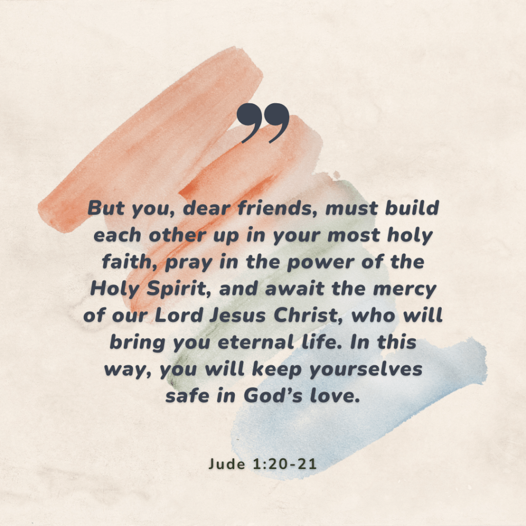 But you, dear friends, must build each other up in your most holy faith, pray in the power of the Holy Spirit, and await the mercy of our Lord Jesus Christ, who will bring you eternal life. In this way, you will keep yourselves safe in God’s love. Jude 1:20-21