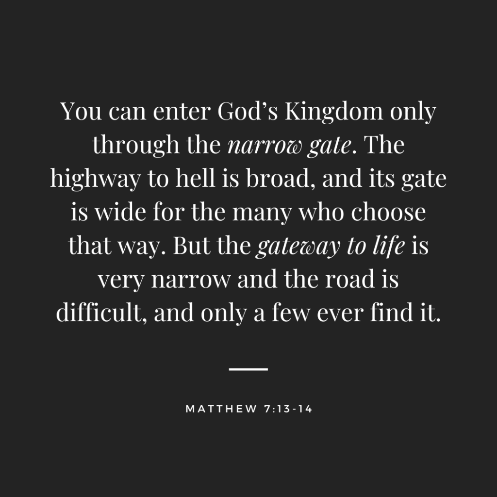 You can enter God’s Kingdom only through the narrow gate. The highway to hell is broad, and its gate is wide for the many who choose that way. But the gateway to life is very narrow and the road is difficult, and only a few ever find it. Matthew 7:13-14
