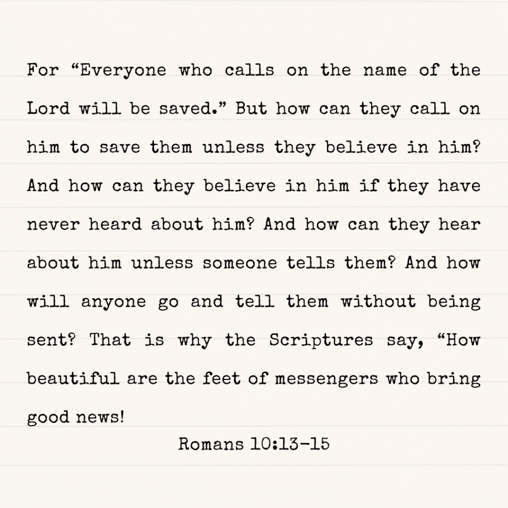 For “Everyone who calls on the name of the Lord will be saved.” But how can they call on him to save them unless they believe in him? And how can they believe in him if they have never heard about him? And how can they hear about him unless someone tells them? And how will anyone go and tell them without being sent? That is why the Scriptures say, “How beautiful are the feet of messengers who bring good news! Romans 10:13-15