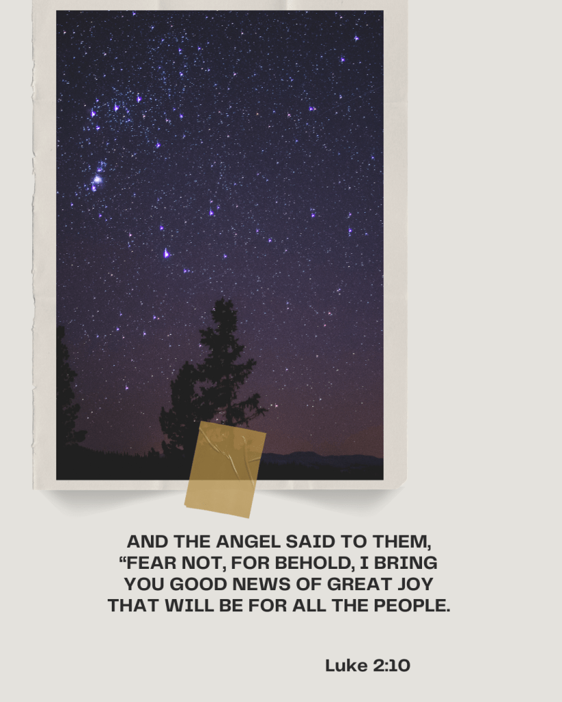 And the angel said to them, “Fear not, for behold, I bring you good news of great joy that will be for all the people. Luke 2:10