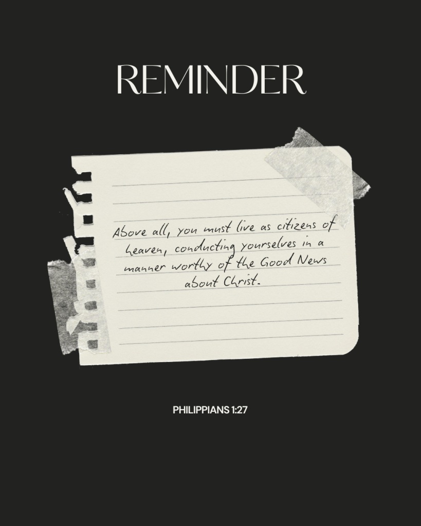 Above all, you must live as citizens of heaven, conducting yourselves in a manner worthy of the Good News about Christ. Philippians 1:27
