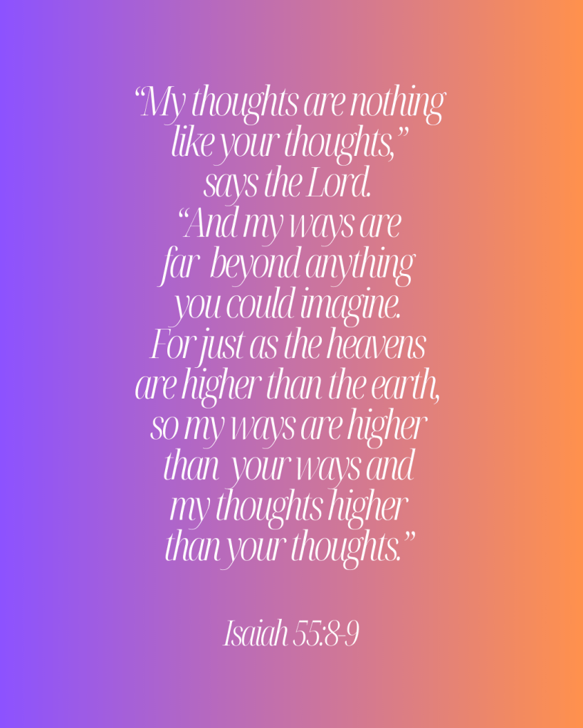 “My thoughts are nothing like your thoughts,” says the Lord. “And my ways are far beyond anything you could imagine. For just as the heavens are higher than the earth, so my ways are higher than your ways and my thoughts higher than your thoughts.” Isaiah 55:8-9