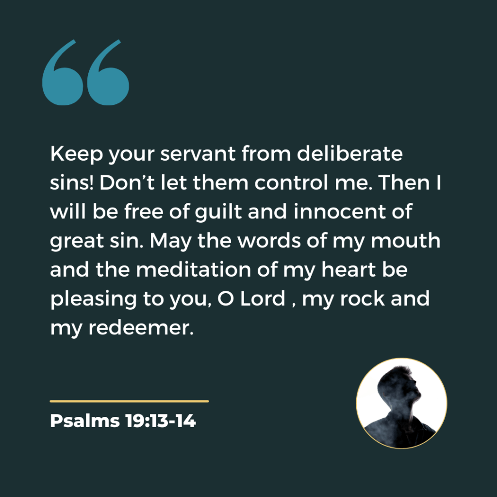 Keep your servant from deliberate sins! Don’t let them control me. Then I will be free of guilt and innocent of great sin. May the words of my mouth and the meditation of my heart be pleasing to you, O Lord , my rock and my redeemer. Psalms 19:13-14