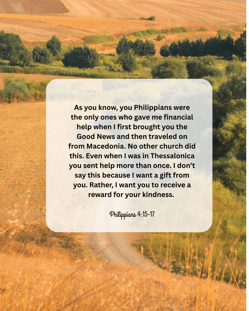 As you know, you Philippians were the only ones who gave me financial help when I first brought you the Good News and then traveled on from Macedonia. No other church did this. Even when I was in Thessalonica you sent help more than once. I don’t say this because I want a gift from you. Rather, I want you to receive a reward for your kindness. Philippians 4:15-17