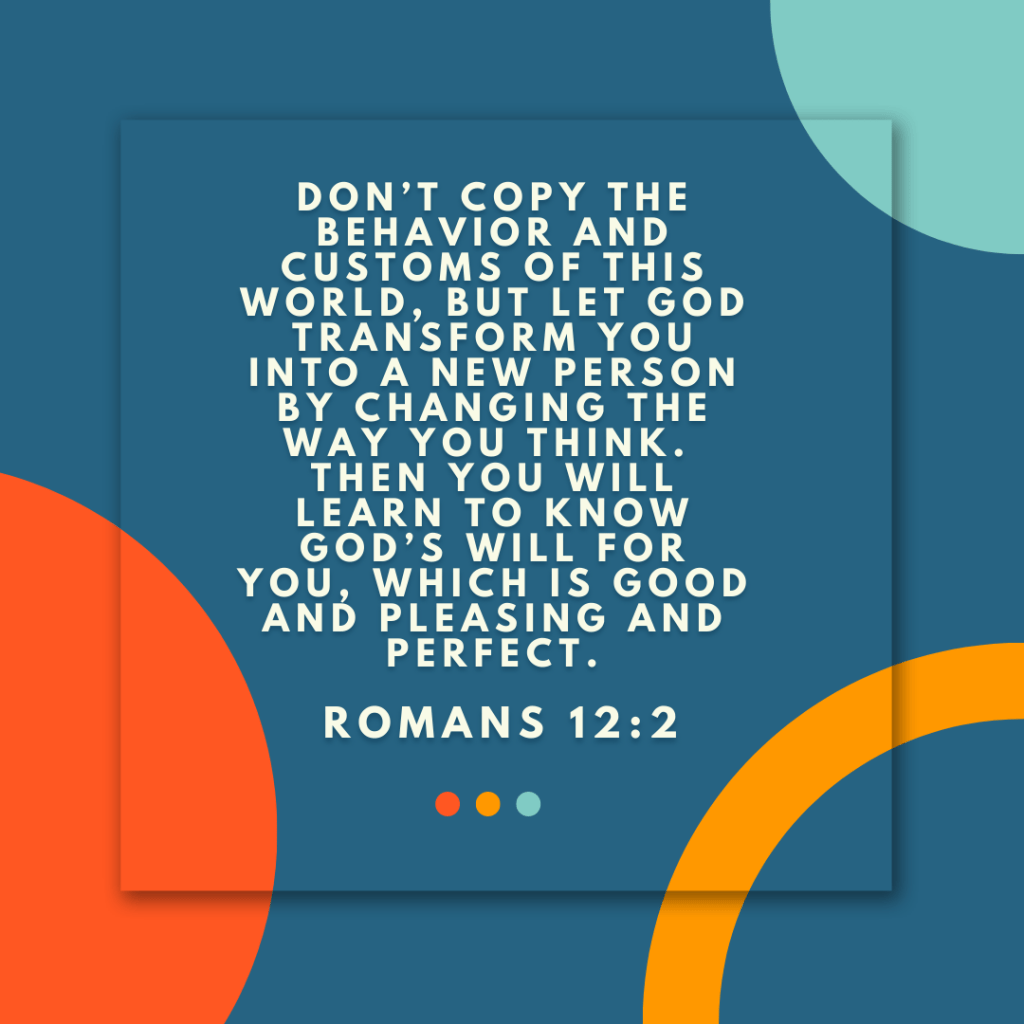 Don’t copy the behavior and customs of this world, but let God transform you into a new person by changing the way you think. Then you will learn to know God’s will for you, which is good and pleasing and perfect.