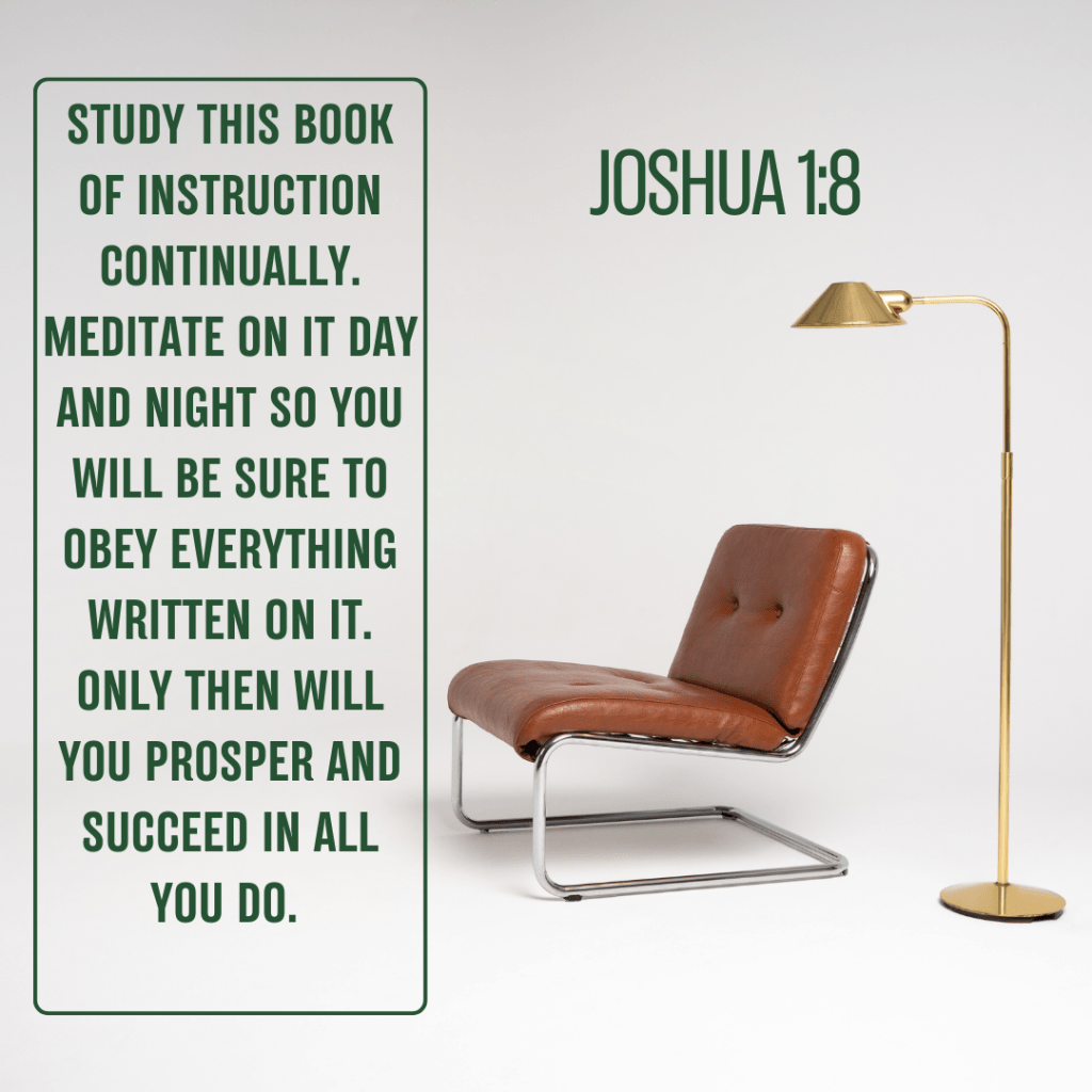 Study this Book of Instruction continually. Meditate on it day and night so you will be sure to obey everything written on it. Only then will you prosper and succeed in all you do. Joshua 1:8